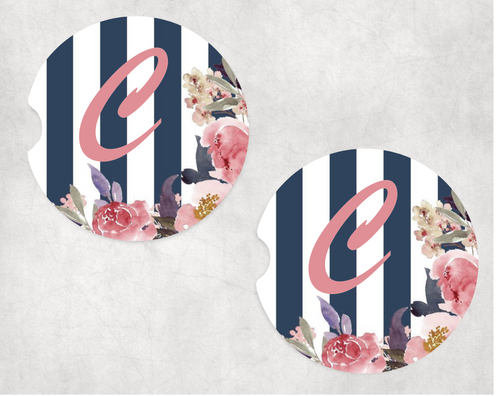 NAVY STRIPE W/ INITIAL SANDSTONE CAR COASTERS (SINGLE)